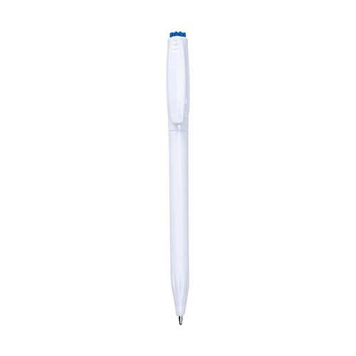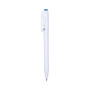 Descrição: Caneta plástica branca com detalhe colorido. Possui detalhes em relevo na parte superior ao redor do clip, parte inferior com detalhes em relevo. Aciona por clique e para destravar basta apertar a parte inferior do clip.
